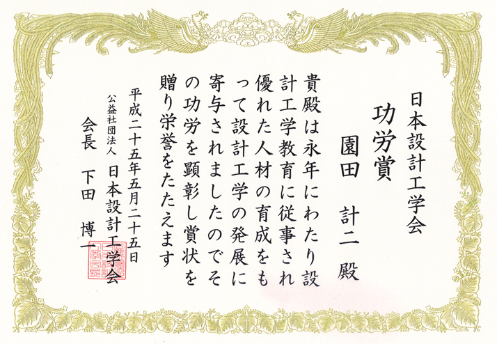 5月25日、本学機械工学科主任の園田計二教授が日本設計工学会功労賞を受賞されました.この賞は2003年より日本設計工学会にて、設計工学の分野における教育に多大な功労のあった教育者に対し,その功労を称え,設計工学の発展に寄与した業績を顕彰することを目的に創設されています.