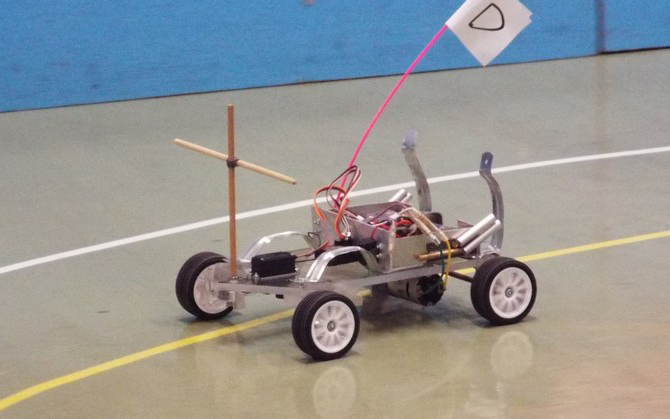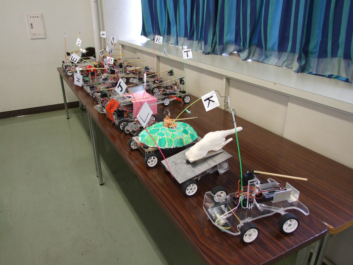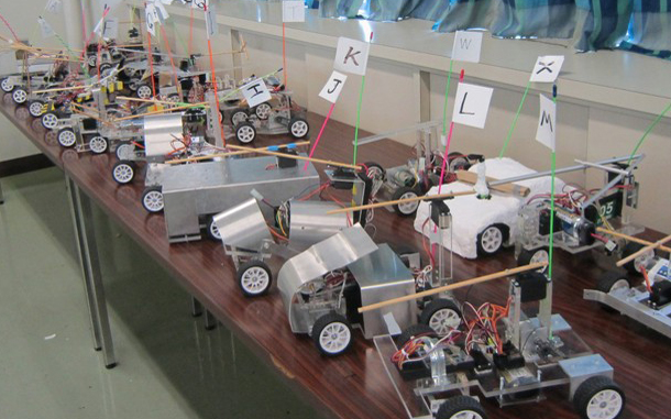 本学では大学入学後の前期において「ロボット製作」という講義が開講されます.これは入学初期の学生に楽しみながら「機械工学とは何か」を体得してもらうため「ものづくり教育」の一環として実施される講義です.学生達は、3〜4人のチームにわかれ、4月から7月末までの4ヶ月程度の間、与えられたテーマ(本年度はランサー(槍騎兵)ロボット)やルールに沿って1台のロボットを製作します.その集大成とも言うべきコンテストが8月6日、本学にて開催されました。本年度は個性豊かな総勢20台のロボットが完成し、出走しました.コンテストでは思い通りに動かない車両もありましたが、ロボット製作に真剣に取り組んできた学生達は、チームを越えてお互いを応援していました.今回の結果を胸に、物を作ることの本質を更に追求してもらいたいと思います.