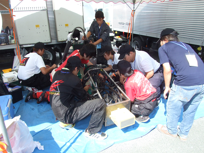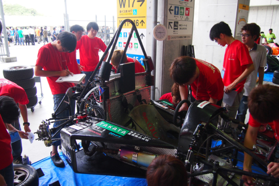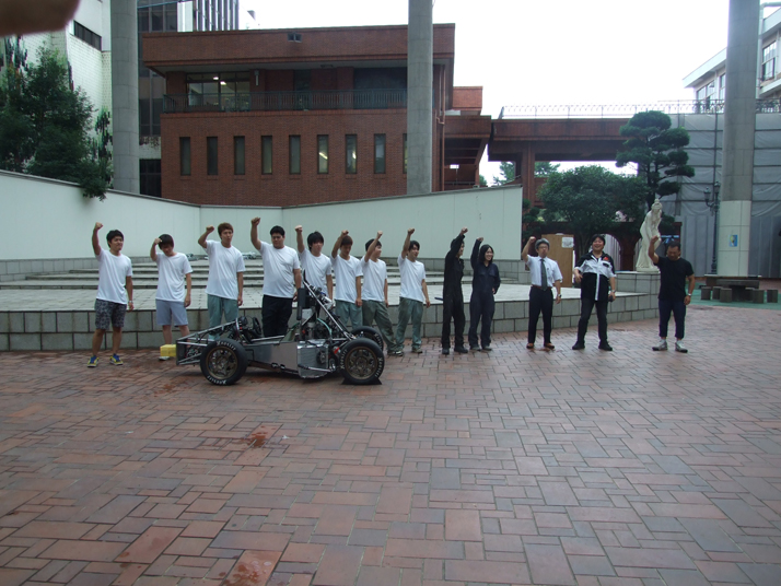 静岡県小笠山総合運動公園(ECOPA)にて第11回全日本学生フォーミュラ大会が4日間に渡り開催されました.本学は4度目の参戦となりました.大会初日は3年生を中心に、ピリピリした緊張感の中、車検および静的審査(プレゼンテーション、コスト、デザイン審査)に挑みました.車検では予想以上に問題点が続出しましたが、チーム一丸のとなって車両修正を行い、2日目の午後には無事全車検を通過しました.結果として動的競技であるアクセラレーション(加速性能)、スキッドパッド(旋回性能)には出場できませんでしたが、午後からのオートクロスは出場&完走を果しました.最終競技エンデュランスではトラブルを抱えた車両ではありましたがチームの気持ちは切れることなく、見事本学初出場を果しました.最終的な総合成績は56位と悔しい結果になりましたが、1年間努力してきたチームメンバーは自分の持てる全ての力を出し切り、最後まで諦めることなく大会を戦い抜きました.限られた時間で要求された仕事をこなし、土壇場での決断を要求される正に“エンジニアの現場”を戦い抜いたチームメンバーを誇りに思うと共に、今後の活躍を大いに期待しています.