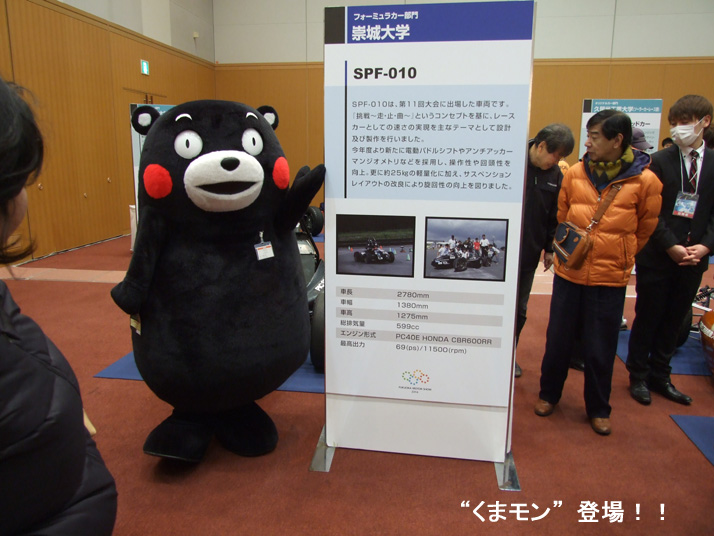 本年1月24日〜27日の4日間、福岡モーターショー2014が開催されました.本学は北部九州自動車未来展の九州学生製作車両展フォーミュラ部門に2013年度大会フォーミュラ車両を出展しました.連日大盛況の中,途切れることなく訪れる来場者に対し,本学学生は自ら製作した車両の特徴やコンセプトを存分にアピールすることが出来ました(途中“くまモン”が応援に来てくれる一コマも!).