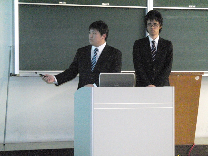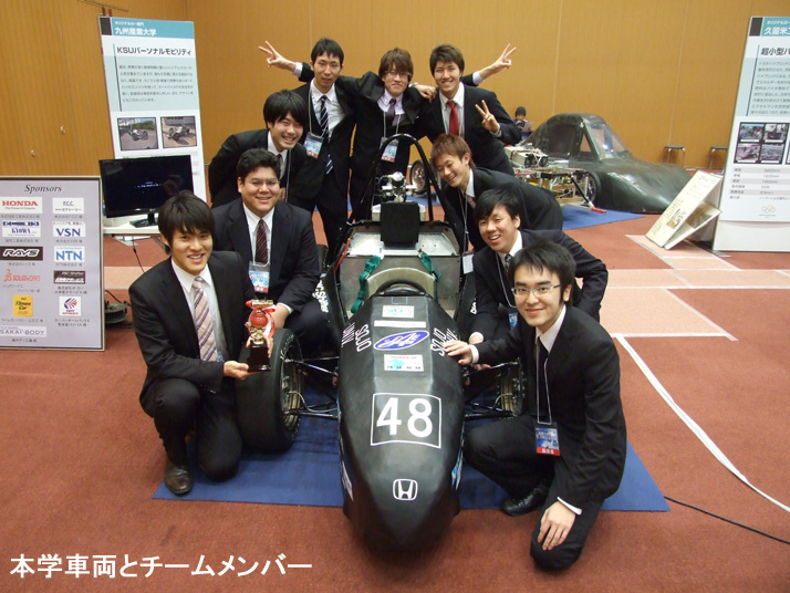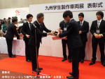 また,26日には九州学生製作車両展各車両に対する審査会が行われ,本学はフォーミュラカー部門にて“最優秀賞”を受賞しました.この賞は学生の自動車製作意欲と技術水準を高め,もって北部九州の自動車産業の振興を図ることを目的としています.審査では事前に提出した企画書を基に,日産九州,トヨタ九州,ダイハツ九州の代表取締役社長が当日学生達に対して口頭試問を行い,技術力,独創性およびデザイン性などが評価されます.