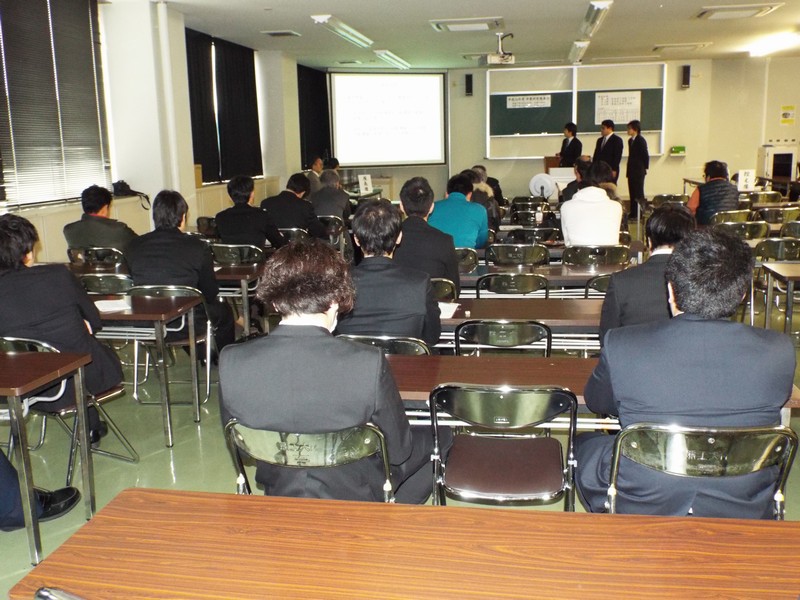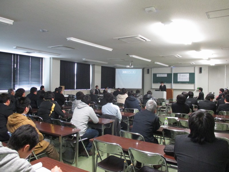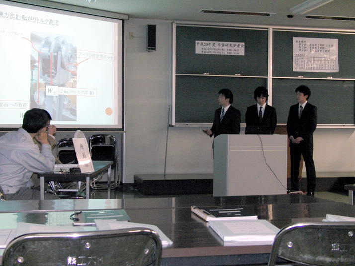 4年生にとっては卒業への最終関門(最終口頭試問)である卒業論文発表会が2/12および13日の2日間に渡り、機械工学科棟508教室にて開催されました.卒業研究では3年間で学んだ事柄をベースに,自分自信の考えを持って課題に対する解を見出す力を身につけなければなりません.社会人と同等のことが要求されますので,OJT的に大学での学習内容の総仕上げをしながら社会人として,エンジンニアとして要求される必要最低限の事項を徹底的に訓練されます.発表会では教員から厳しい質問や指摘が示される場面もありましたが,その質問に自らの考えをもって対応する経験は学生達にとって大変貴重であったと思います.この経験が春からの社会人生活および大学院での勉学の糧になることと確信しています.
