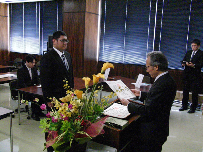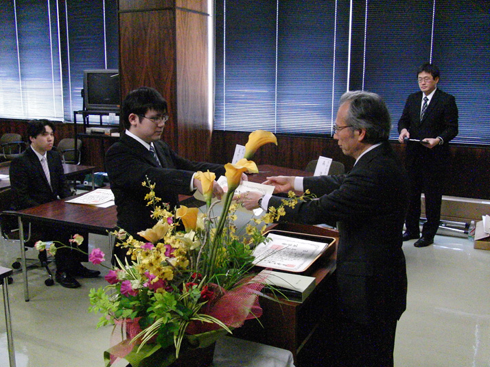 今年は機械工学専攻5名の学生が大学院工学研究科修士課程を修了し、3/10、機械工学科会議室において学位記の授与が行われました.指導教員・保護者列席のもと学位記授与および表彰が行われました.学生達は学部・修士6年間の思い出や卒業の喜びを顔一杯に溢れさせると共に学位記の重みを実感しているようでした.その後には卒業生と指導教員との昼食会が催され、卒研室での懐かしい話に花を咲かせていました.様々な思いを胸に各人4月からは新天地で精一杯頑張ってくれることでしょう.
