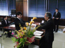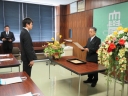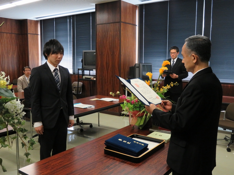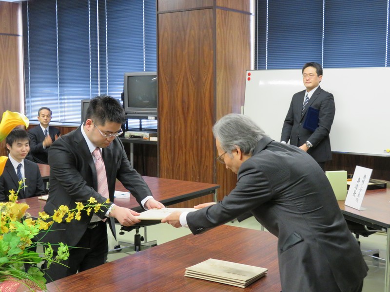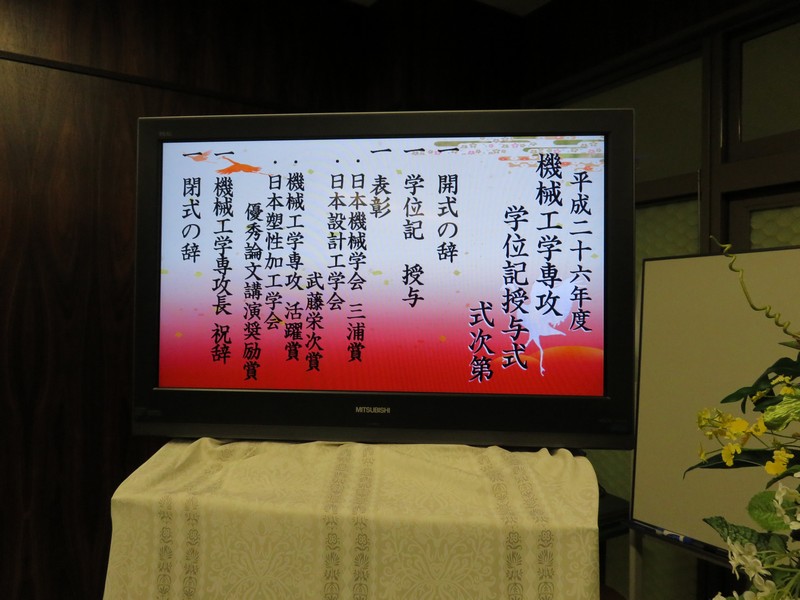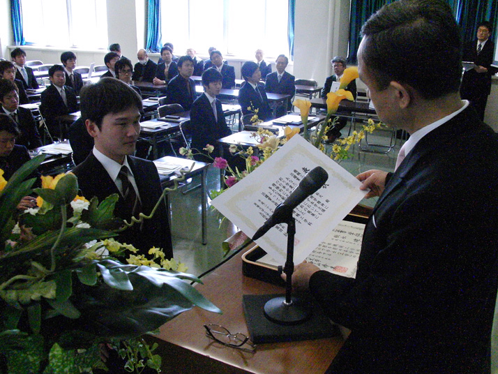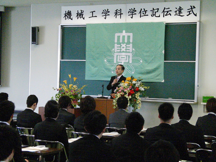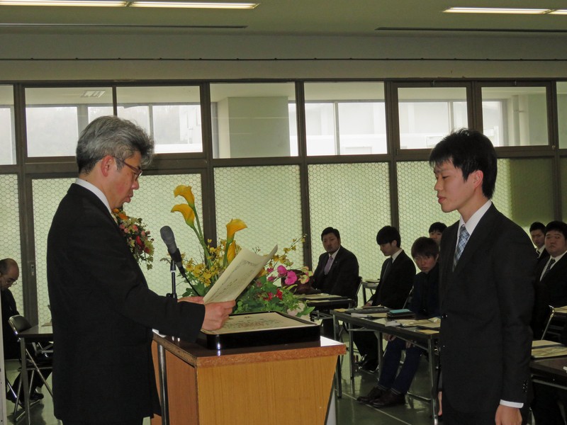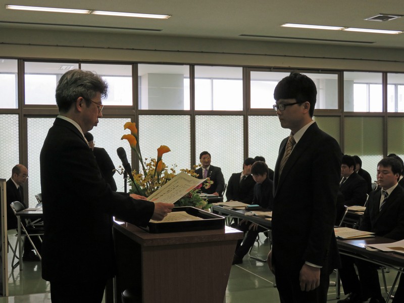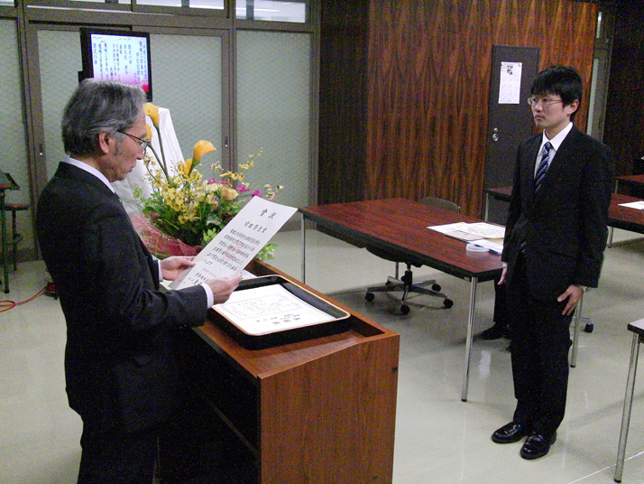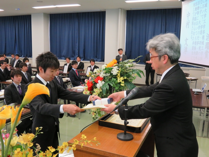 平成26年度大学院修了式ならびに機械工学専攻学位記授与式が3月10日(火)に本学池田キャンパスで挙行されました.なお,全専攻に対する大学院修了式が挙行された後に,専攻ごとに学位記授与式が行われることになっています.機械工学専攻の学位記授与式は,機械工学科会議室で挙行されました.まず,大学院修士課程2年生5名に対し,修士の学位記が授与されました.つぎに,学会賞ならびに専攻賞の表彰が行われました.最後に,専攻長から祝辞が述べられました.本専攻で学んだことを活かし,社会で活躍してくれることを願っています.