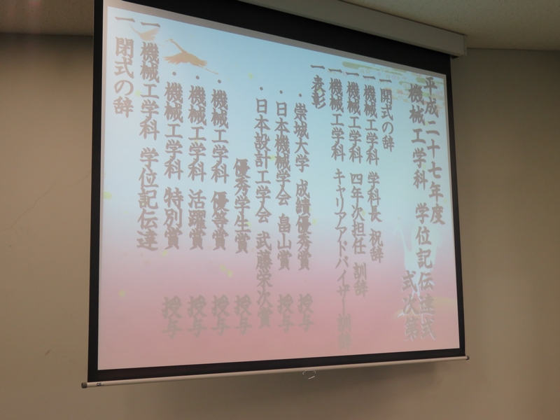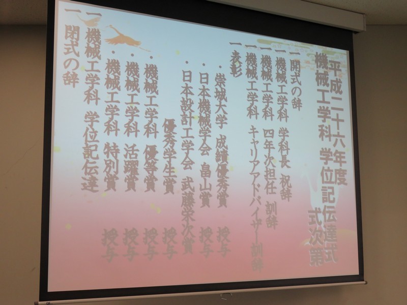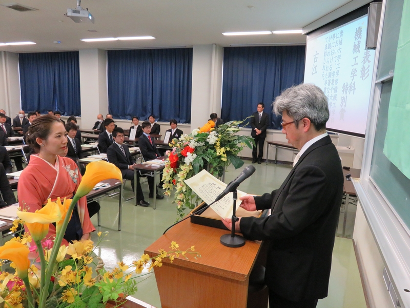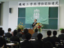 平成27年度卒業式ならびに機械工学科学位記伝達式が3月15日(火)に挙行されました.卒業式は,全学科卒業生を対象に10時30分から崇城大学体育会館で行われました.卒業式の後に,機械工学科では,場所をI号館601教室に移し,学位記伝達式が挙行されました.伝達式では,まず学科長から祝辞が述べられ,さらに4年生担任ならびにキャリアアドバイザー(就職担当)から訓辞が伝えられました.つぎに,学会賞ならびに学科賞の表彰が行われました.最後に,機械工学科卒業生一人一人に対し,学科長から学士の学位記が授与されました.本学科で学んだことを活かし,社会で活躍してくれることを願っています.