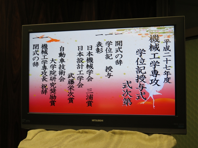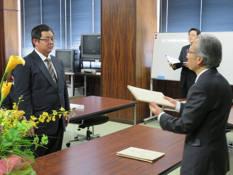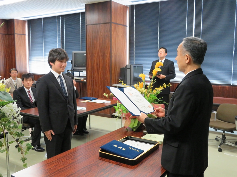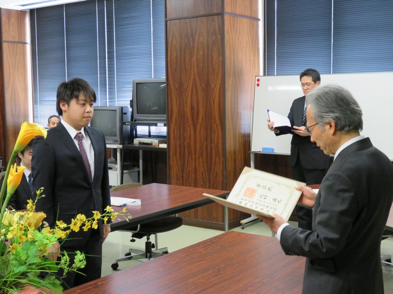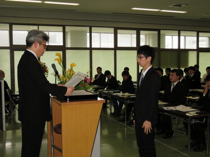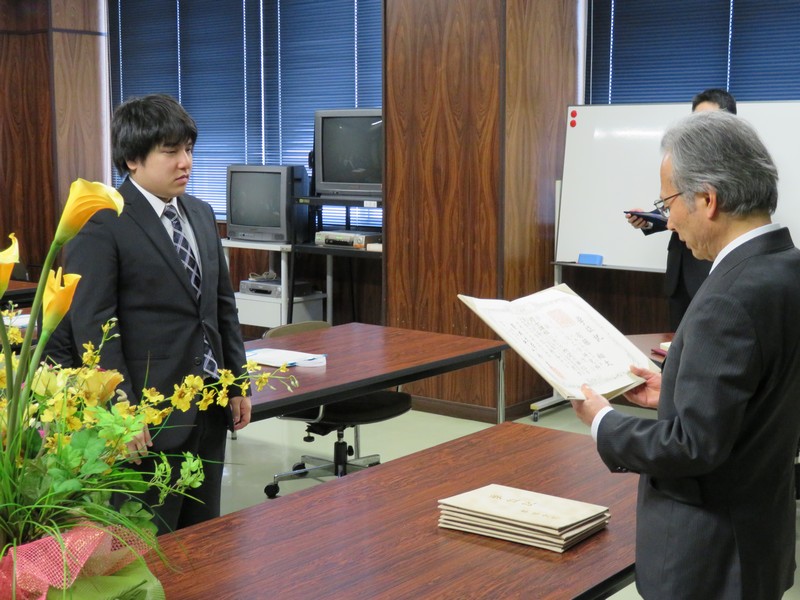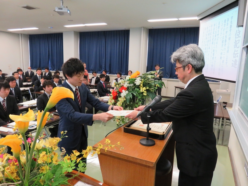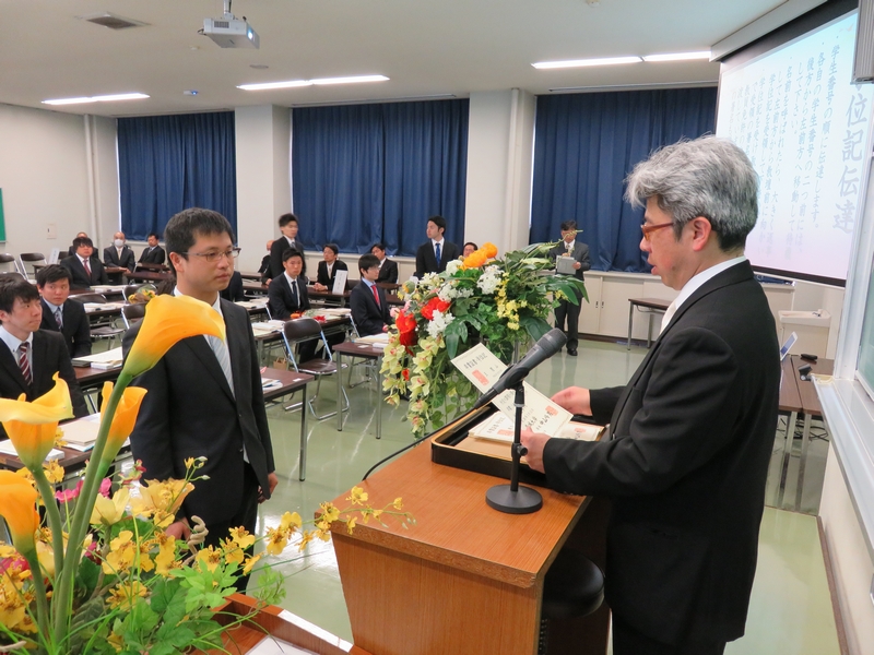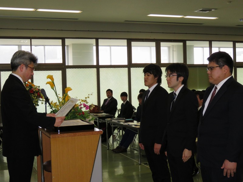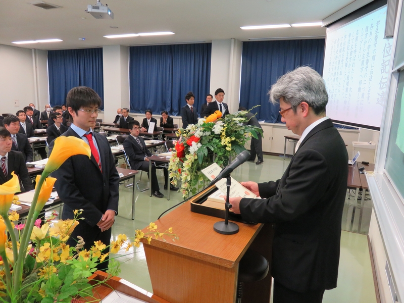 平成27年度大学院修了式ならびに機械工学専攻学位記授与式が3月10日(木)に本学池田キャンパスで挙行されました.なお,全専攻に対する大学院修了式が挙行された後に,専攻ごとに学位記授与式が行われることになっています.機械工学専攻の学位記授与式は,機械工学科会議室で挙行されました.まず,大学院修士課程2年生4名に対し,修士の学位記が授与されました.つぎに,学会賞の表彰が行われました.最後に,専攻長から祝辞が述べられました.本専攻で学んだことを活かし,社会で活躍してくれることを願っています.