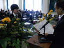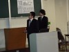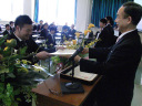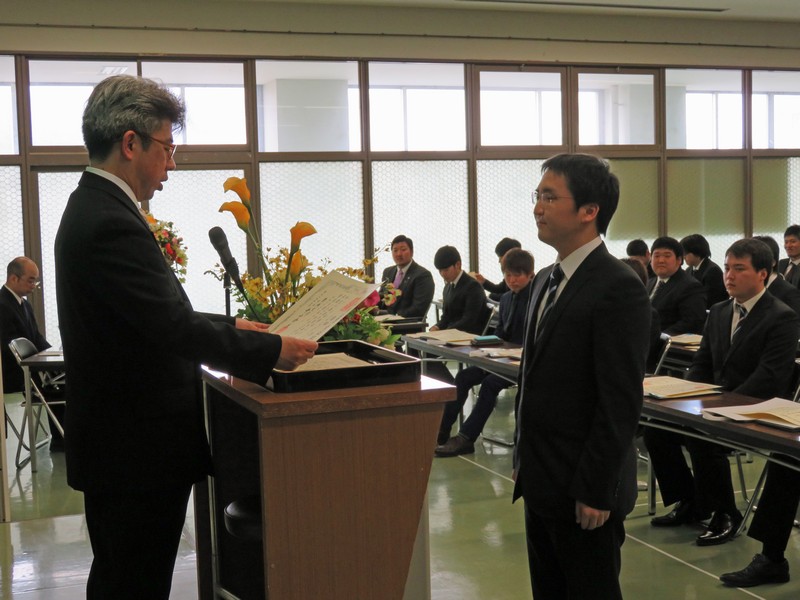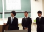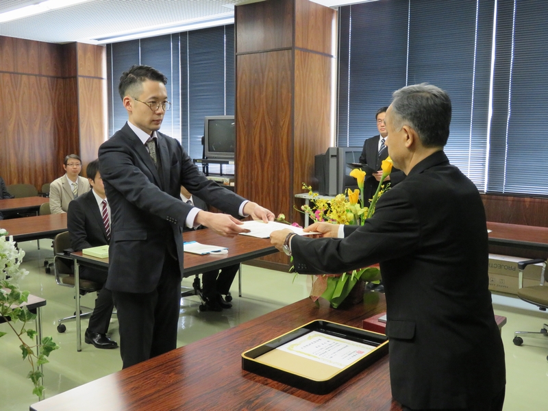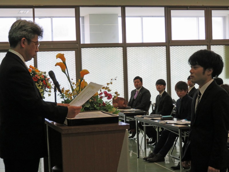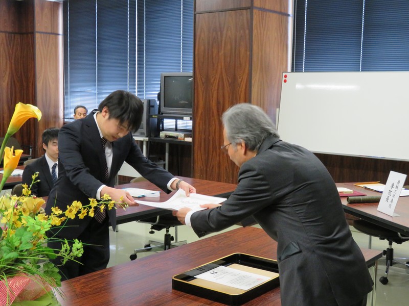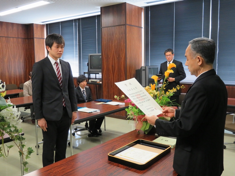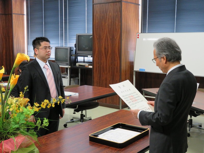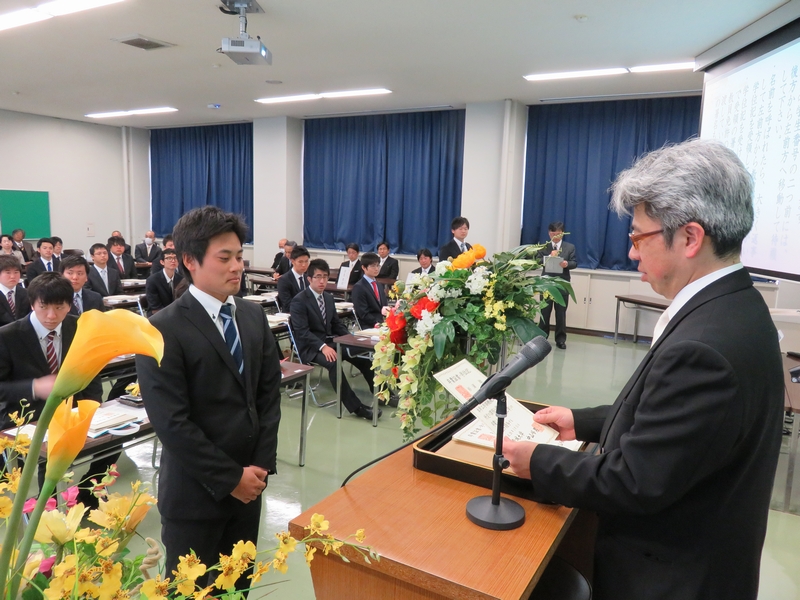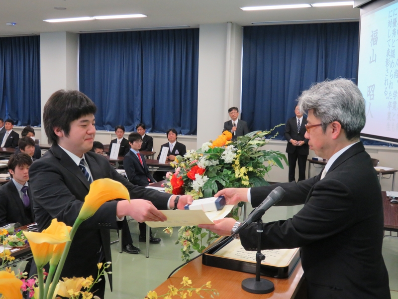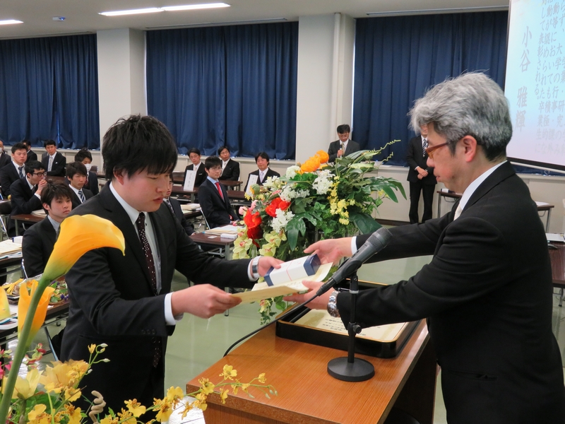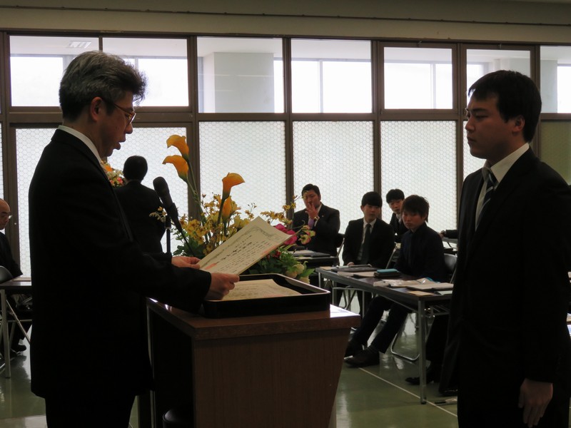 平成27年度大学院修了式ならびに機械工学専攻学位記授与式が3月10日(木)に本学池田キャンパスで挙行されました.なお,全専攻に対する大学院修了式が挙行された後に,専攻ごとに学位記授与式が行われることになっています.機械工学専攻の学位記授与式は,機械工学科会議室で挙行されました.まず,大学院修士課程2年生4名に対し,修士の学位記が授与されました.つぎに,学会賞の表彰が行われました.最後に,専攻長から祝辞が述べられました.本専攻で学んだことを活かし,社会で活躍してくれることを願っています.