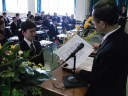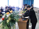 平成26年度卒業式ならびに機械工学科学位記伝達式が3月15日(日)に挙行されました.卒業式は,全学科卒業生を対象に10時30分から市民会館崇城大学ホール(熊本市民会館)で行われました.その後,機械工学科では,場所を池田キャンパスI号館601教室に移し,学位記伝達式が挙行されました.伝達式では,まず学科長から祝辞が述べられ,つぎに4年生担任ならびにキャリアアドバイザー(就職担当)から訓辞が伝えられました.その後,学会賞ならびに学科賞の表彰が行われました.最後に,機械工学科卒業生一人一人に対し,学科長から学士の学位記が授与されました.本学科で学んだことを活かし,社会で活躍してくれることを願っています.