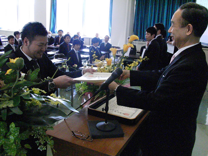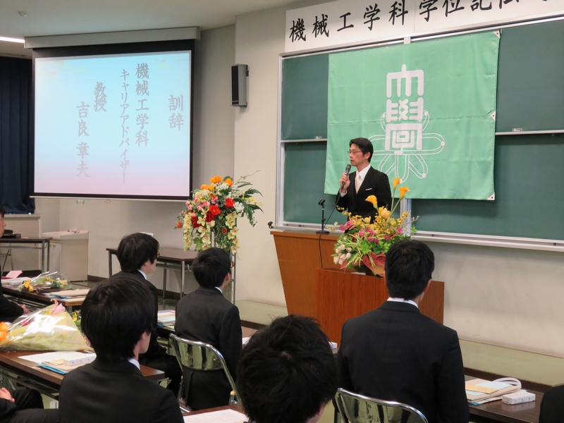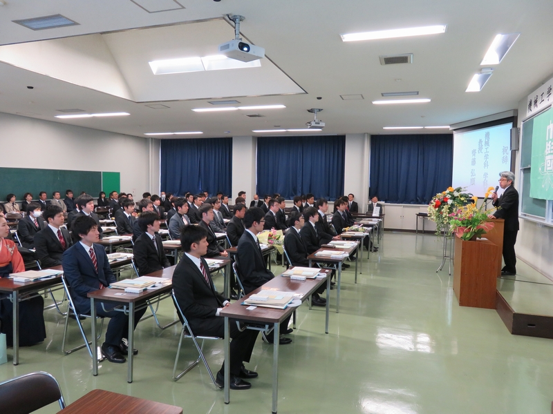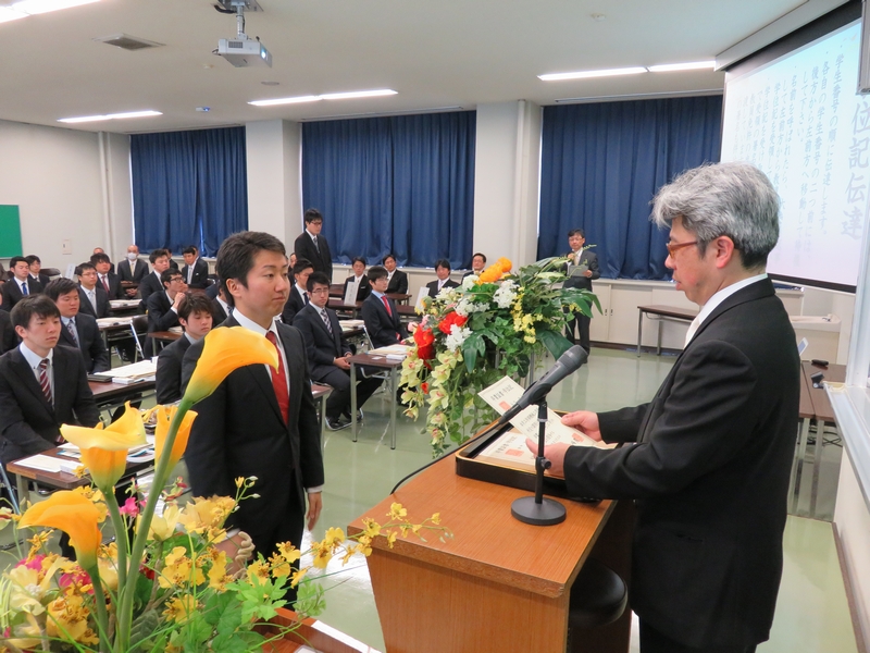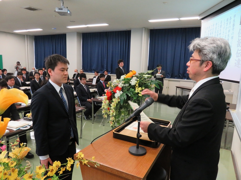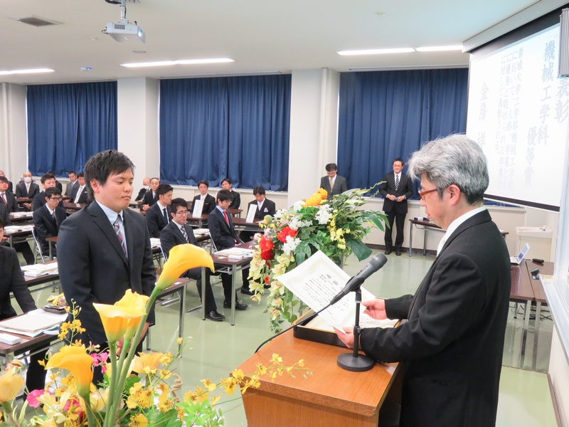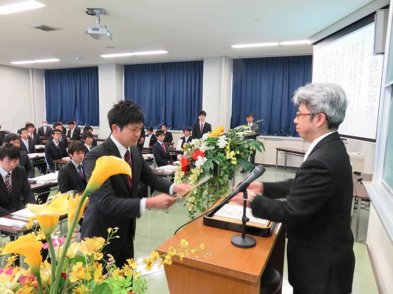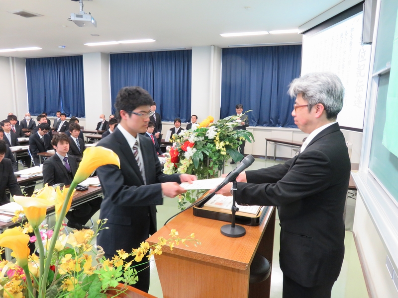 機械工学科61名の学生が卒業を迎えました.午前10:30より崇城大学市民ホールにて第44回崇城大学卒業式・学位記授与式が挙行されました.機械工学科からは大塚賢人君が成績優秀賞として表彰されました.また、午後1:30より場所を大学に移し、機械工学科棟I601教室にて学位記伝達式が執り行われました.機械工学科主任から卒業生一人一人に伝達される学位記.各人4年間の重みを実感しながら、それぞれの思い出と共に大学を巣立っていきました.機械工学科教員一同、今後卒業生が社会で大いに活躍してくれることを祈っています.