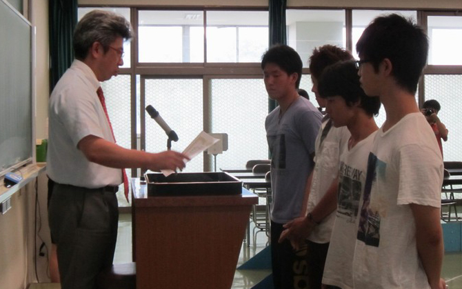 平成26年10月8日付けの「TOPICS」において,平成26年度技能検定(職種:機械加工「普通旋盤(2・3級)」)に工学部機械工学科の学生12名が合格したことをお知らせしました.この度,その合格者の一人である機械工学科3年生の中村文洋君(2級合格)は,成績優秀のために「技能検定試験成績優秀賞」を受賞しました.