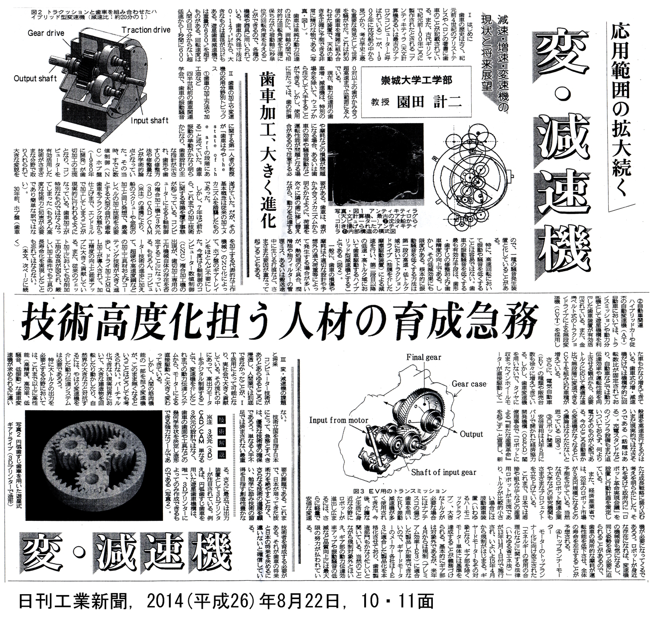 園田計二教授が解説する記事(タイトル:変・減速機)が日刊工業新聞(平成26年8月22日付、10面と11面)に掲載されました.記事では,減速・増速・変速機の歴史と現状が解説されるとともに,その将来展望が述べられています.さらに,園田教授の最新の研究成果「3Dプリンタで作成した円弧歯すじ歯車を用いた遊星式ギアドライブ」も紹介されています.