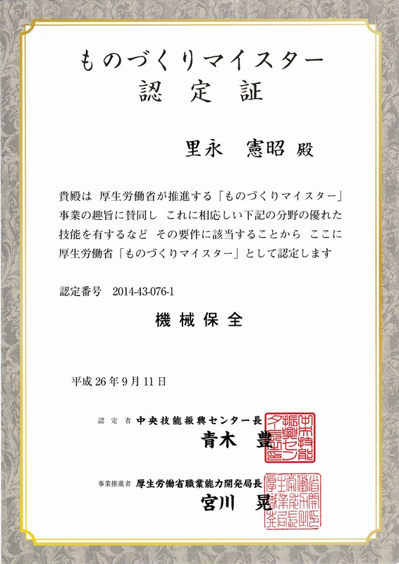 近年,若者のものづくり離れ・技能離れが顕著になっており,若年技能者の育成および技能継承が重要な課題になっています.そこで,厚生労働省「若年技能者人材育成支援等事業(ものづくりマイスター制度)」では,技能職において卓越した技能を有する技術者を「ものづくりマイスター」として認定・登録し,若年技能者に実践的な技術指導を行い,若年技能者の育成および技能継承支援を行っています.このたび里永准教授は,機械保全の職種において卓越した技能を認められ,「ものづくりマイスター」に認定・登録されました.