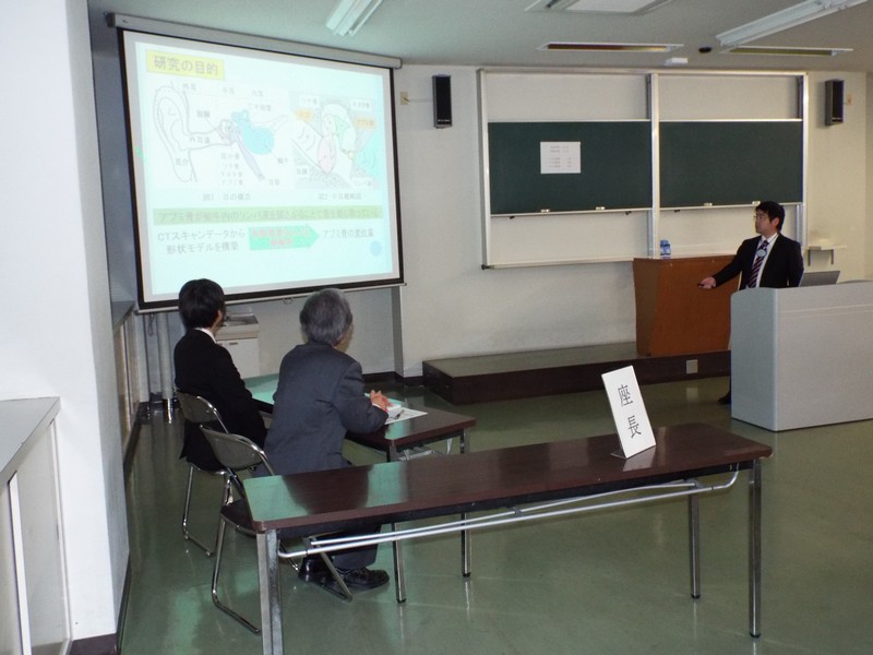 平成26年度崇城大学大学院機械工学専攻の修士論文発表会が平成27年2月5日(木)に機械工学科棟I508教室で開催されました.修士課程2年生5名は,大学院2年間で取り組んだ研究成果を修士論文としてまとめ,本発表会において,その内容を口頭発表しました.どの学生の発表も非常にわかりやすく,質問にも丁寧に回答している姿が印象的でした.