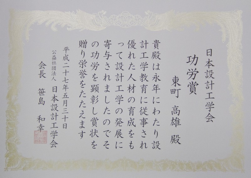 15.05.30. 東町雄特任教授に日本設計工学会から功労賞が授与されました.