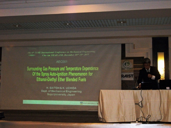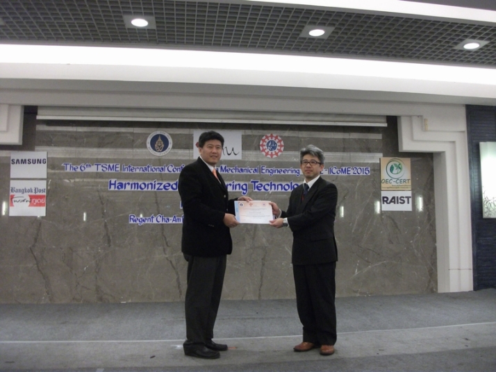 タイのチャアムで12/16〜18に開催された第6回タイ機械学会主催・機械工学に関する国際会議TSME-ICoME 2015(The 6th TSME International Conference on Mechanical Engineering)において、工学部機械工学科の齊藤弘順教授が「代替エネルギと燃焼(Alternative Energy and Combustion)」分野の最優秀論文賞(Outstanding Paper Award)を受賞しました。